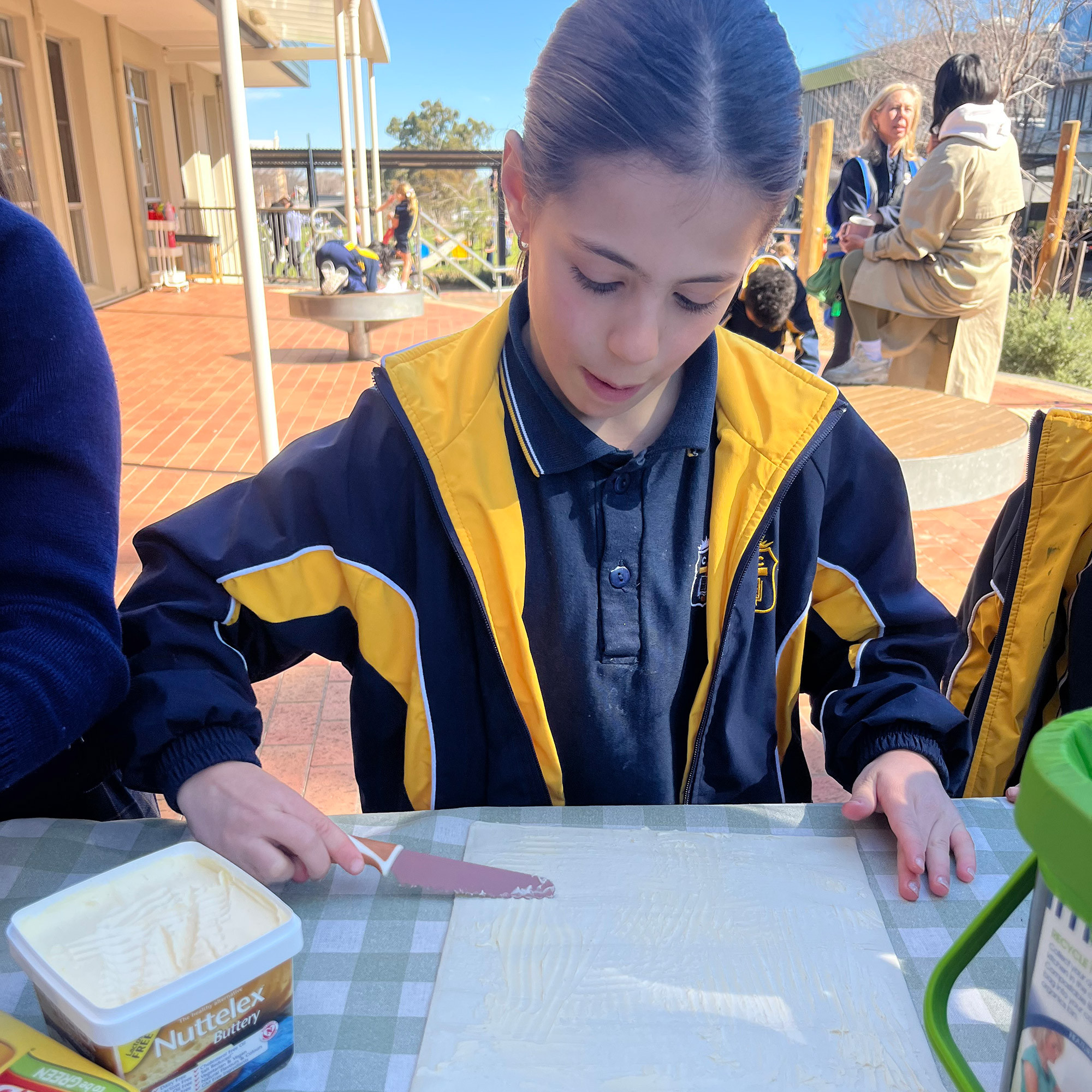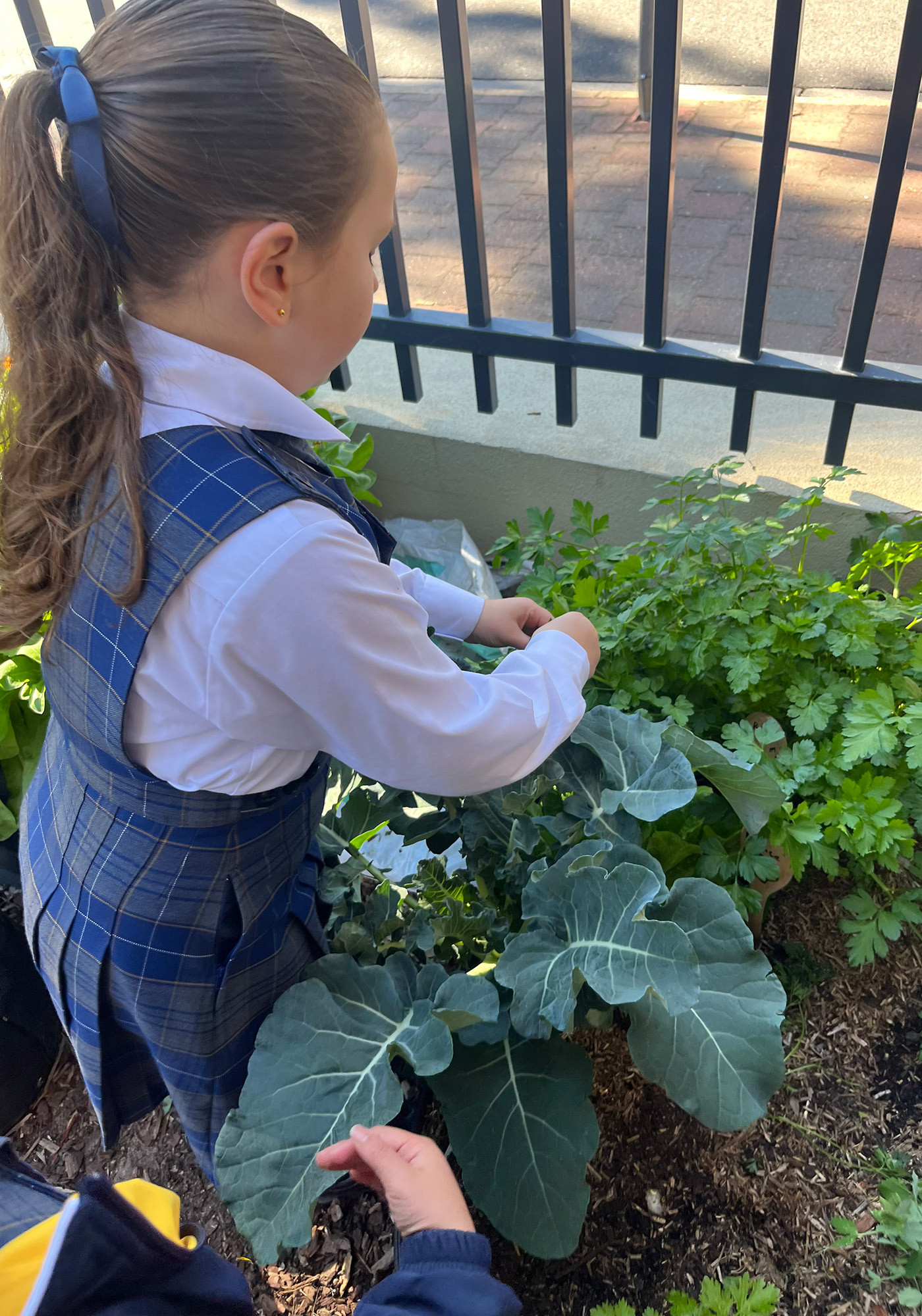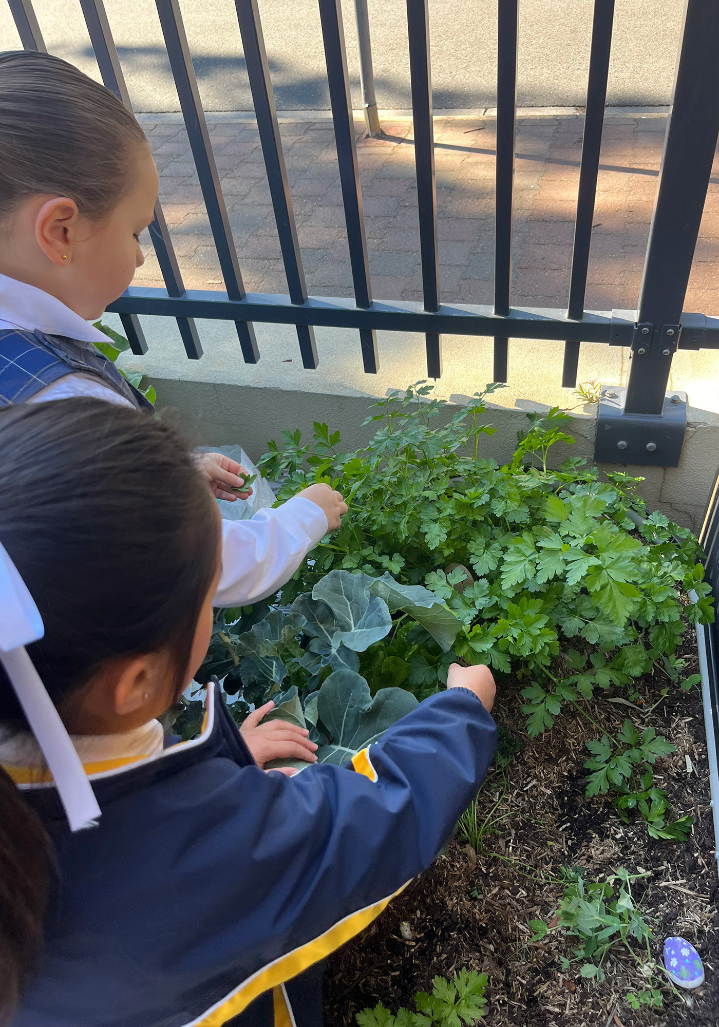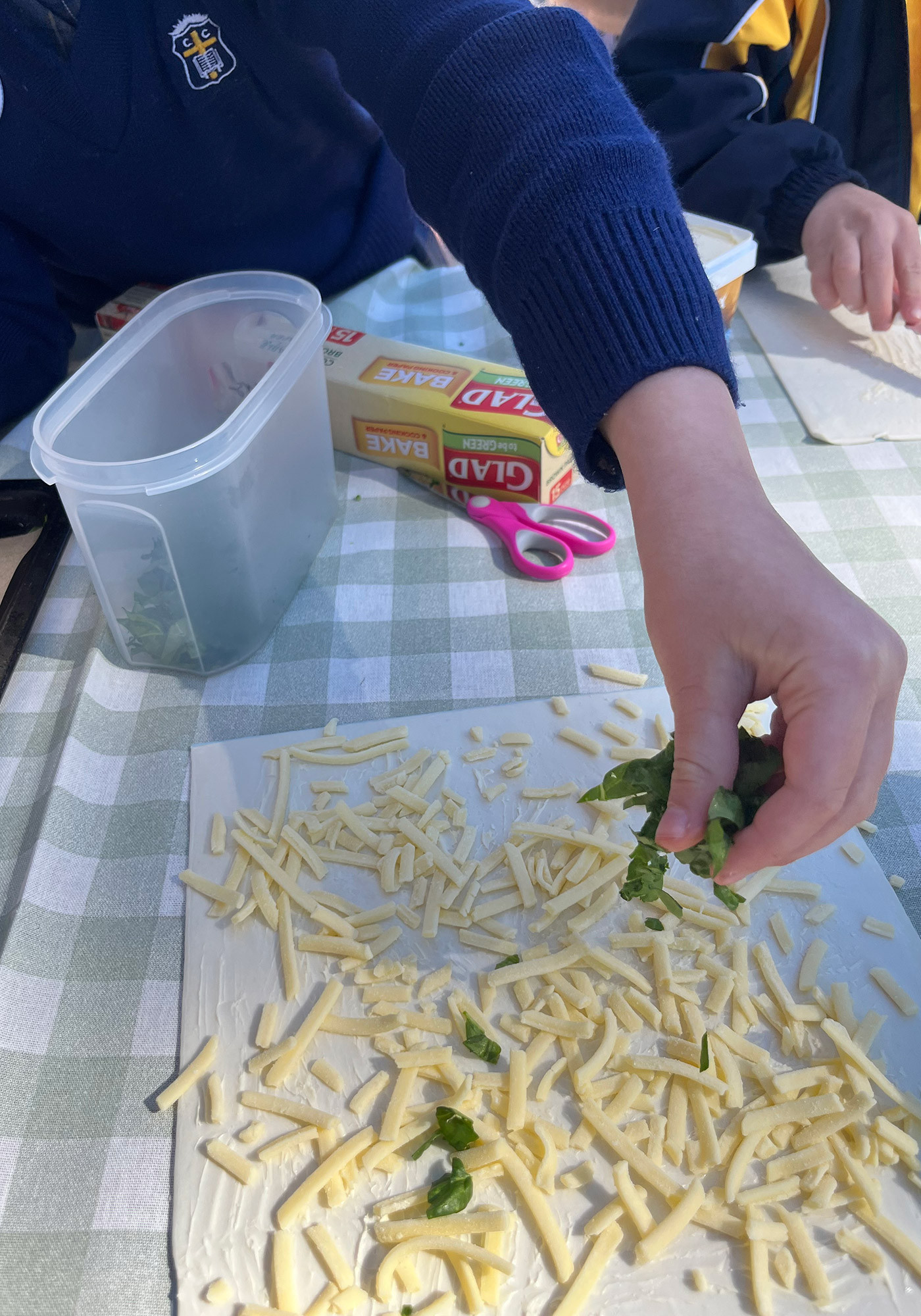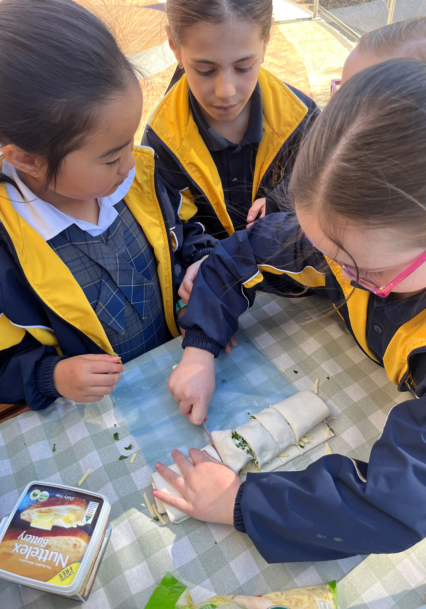 The St John's Campus Junior Primary sustainability captains and other participants have been growing a beautiful vegetable garden this year. Holly (2BM) and Charlotte (2BM) have been leaders in the sustainability group and have been working hard to grow our garden. During Week 5 at Sustainability Club, Junior Primary children gathered at the garden to harvest some food to cook with. Students Charlotte and Ariana (2BM) planted spinach seeds right at the beginning of the year. Some children had the privilege of harvesting the spinach and some parsley and made spinach, cheese and parsley pinwheels.