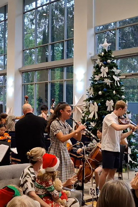 On Friday 28 November, the Music Department at Concordia presented a concert as part of the annual Christmas Tree Lighting celebration at Living Choice. The performance featured the Year 7/8 Choir, String Ensemble, Animato String Quartet, Clarinet Ensemble and Saxophone Quartet, showcasing a wonderful selection of Christmas-themed repertoire and leading the community carols.