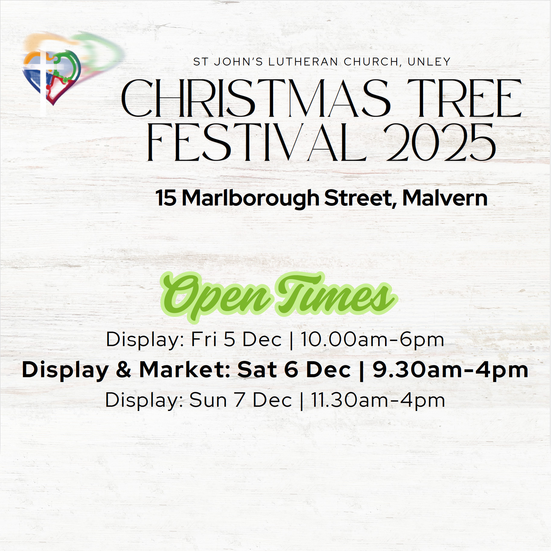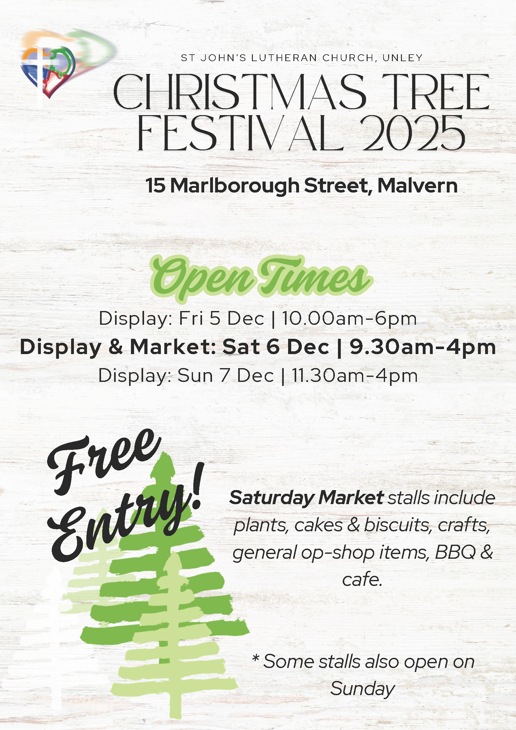A reminder that St John’s Lutheran Church, Unley, would like to warmly welcome you to the Christmas Tree Festival 2025. The Festival will be held on Friday 5 to Sunday 7 December in the St John’s Ministry Centre, 15 Marlborough Street, Malvern.