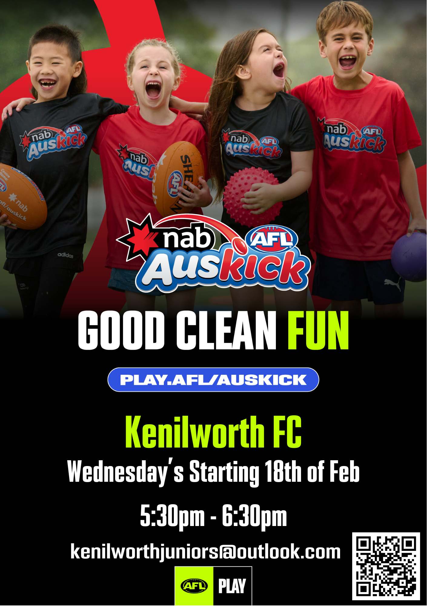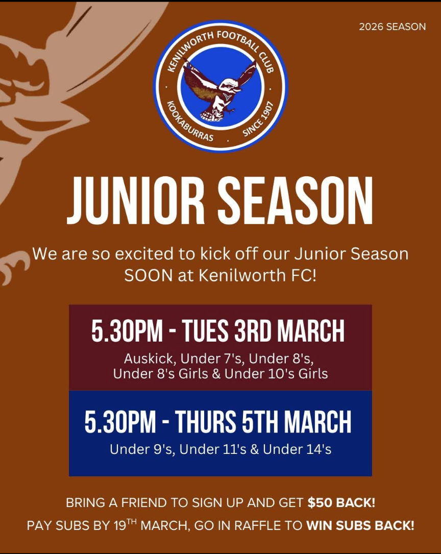 - Kenilworth Kookaburras Football Club hosts Auskick sessions every Wednesday, commencing Wednesday 18 February at 5.30pm. Download a flyer for details. The Club is also soon to commence its 2026 season with junior trainings on Tuesday 3 and Thursday 5 March and they are currently welcoming new junior players across a range of age groups. The Club offers a fun, inclusive environment where children can learn the game, build confidence and be part of a supportive community. Download a flyer for more information.