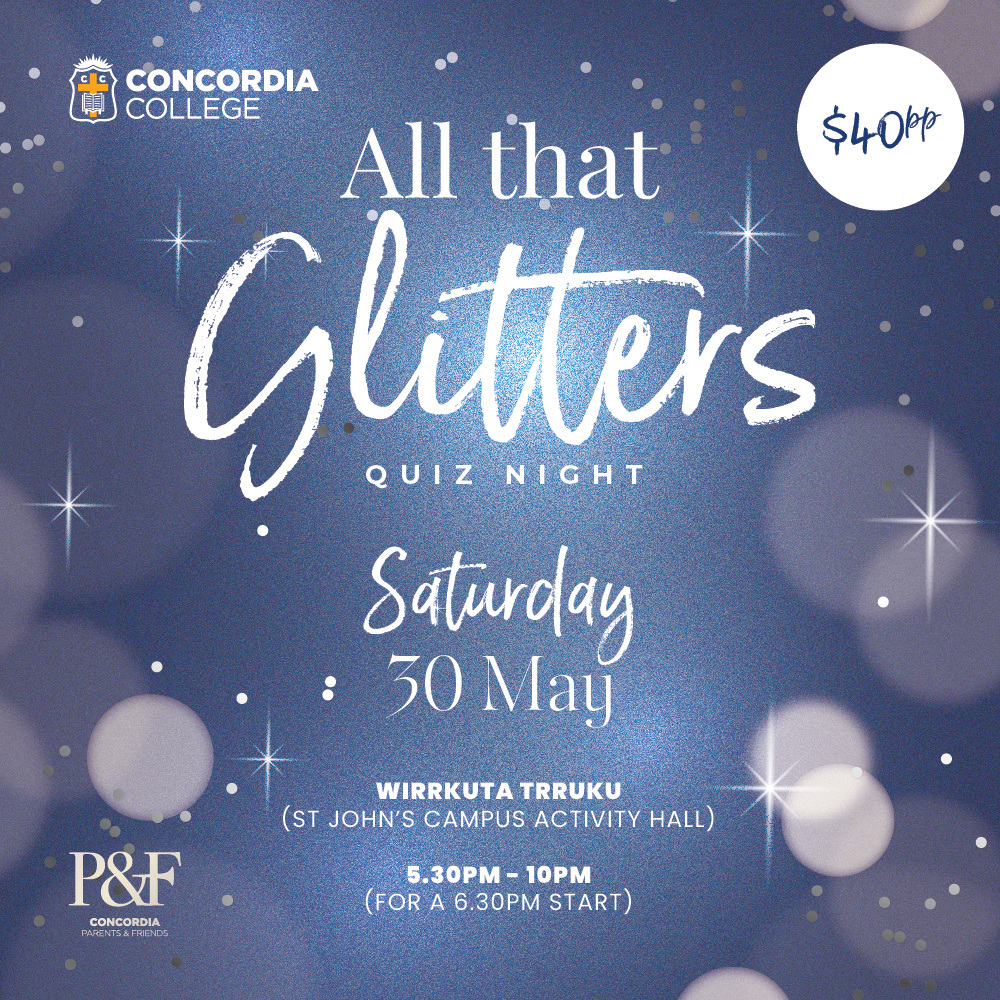 Our 2026 Concordia P&F Quiz Night 'All That Glitters' will be a night of glitz, glamour, sequins, sparkles and sensational brain-teasing fun! Gather your team, dress to impress in something that glitters, and put your knowledge to the test with our expert Old Concordian quiz masters, The Weekly Fifty.