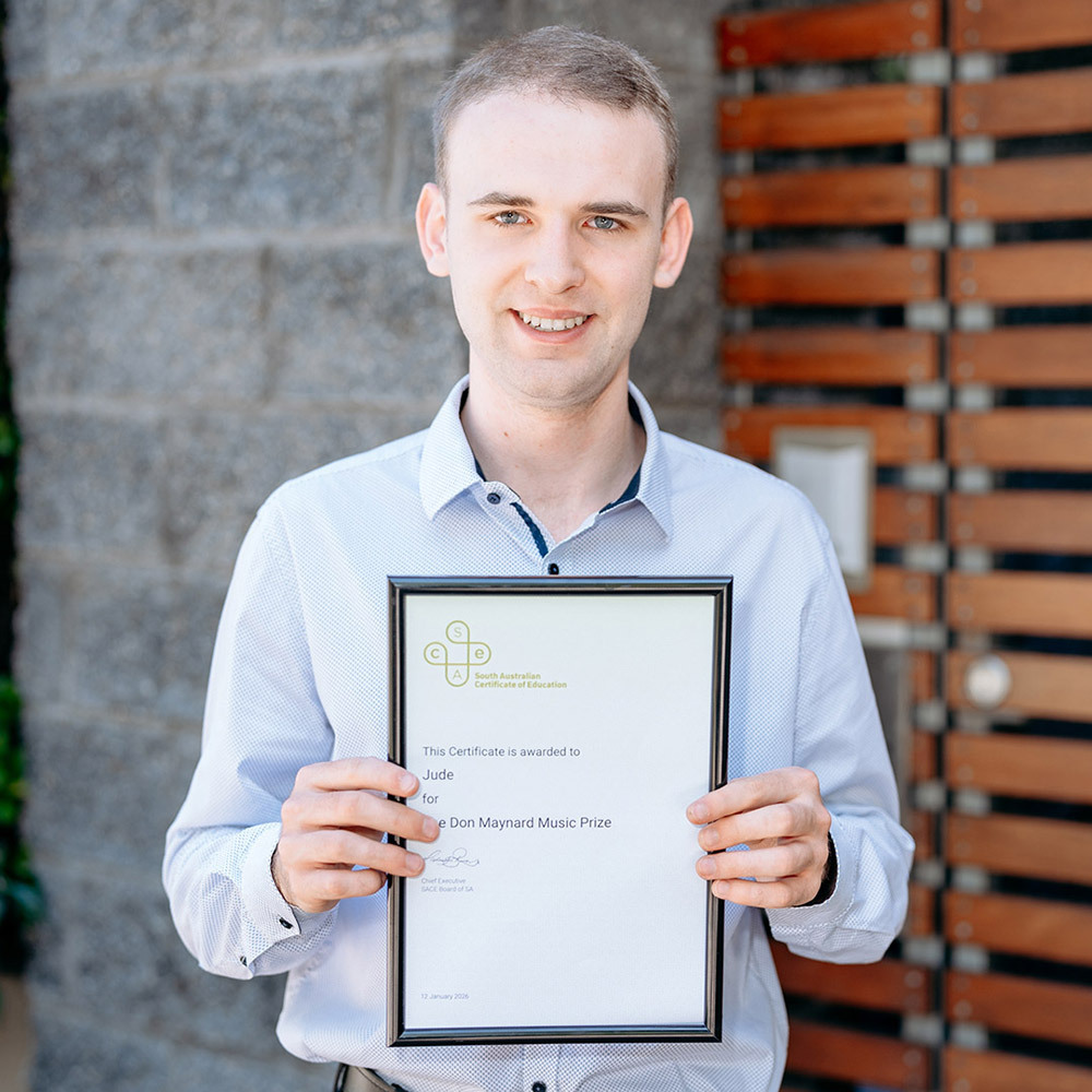 Following the Class of 2025 SACE Merit and Awards ceremony, we were delighted to congratulate Old Concordian Jude on receiving the Don Maynard Music Prize from the SACE Board of South Australia. This annual prize is awarded in recognition of the recipient’s achievement in gaining the highest marks in practical (performance-based) Music subjects across the state.